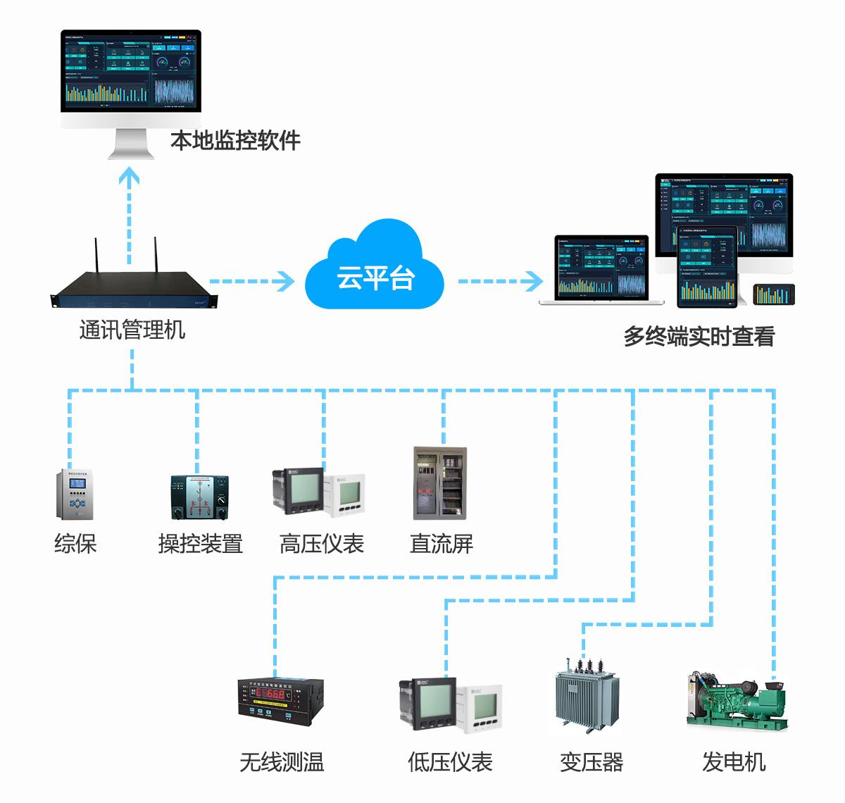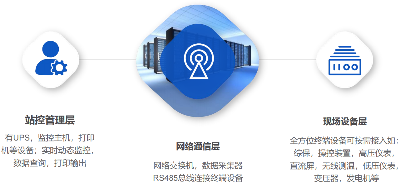 可分为三层:站控管理层、网络通信层和现场设备层,组网方式可为标准网络结构、光纤星型网络结构、光纤环网网络结构,根据用户用电规模、用电设备分布和占地面积等多方面的信息综合考虑组网方式。